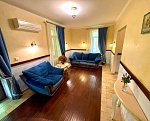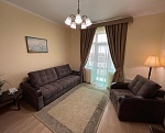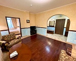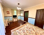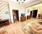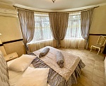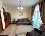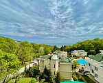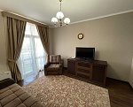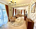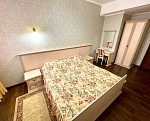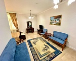 Трехкомнатный, трехместный, спальня - 21,5 кв. м гостиная - 18,4 кв. м, с раскладным 2-х спальным диваном, спальня - 13 кв. м с односпальной кроватью, санузел - 6 кв. м (ванная, туалет, раковина, фен, гигиенический душ), гостевой туалет - 4 кв. м (раковина, туалет), прихожая - 8,5 кв. м, 2 балкона с видом на море и на лесопарковую зону.