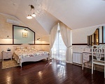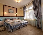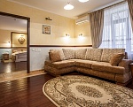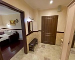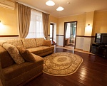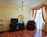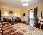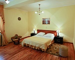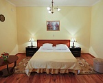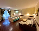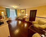 Номер оборудован 2 телевизорами, холодильником , 2 телефонами, сейфом . В номере имеются дополнительные места. Напольное покрытие – ламинат или натуральное дерево с плиткой.