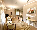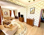 В номере имеется: три телевизора, телефон, три сплит-системы, сейф. В гостиной: раскладывающийся диван, два кресла, журнальный столик, комод с барным холодильником, горка с чайным сервизом и набором бокалов, письменный стол, одна спальня оборудована французской кроватью, другая - двумя раздельными кроватями, в каждой спальне - шифоньер, трюмо, два кресла и журнальный столик.