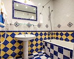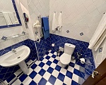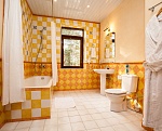 Номер оборудован телевизором, холодильником, телефоном, сейфом. Напольное покрытие – ламинат или натуральное дерево и плитка.