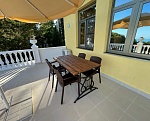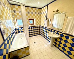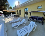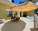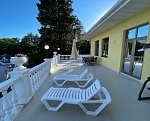 Второй этаж : трехкомнатный, четырехместный номер, южная сторона, общая площадь номера - 120 кв.м, гостиная 35, 7 кв.м, две спальни 33,0 и 29,7 кв.м, санузел (раковина, туалет с гигиеническим душем, ванная, фен) - 8 кв.м; гостевой туалет 3,5 кв.м, просторная терраса с великолепным видом на море, оборудованная шезлонгами, лежаками и столиком с четырьмя креслами - 47,5 кв.м.